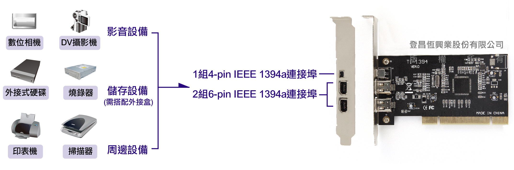 IEEE 1394a裝置支援熱插拔,可連接最多63部外接裝置 | |